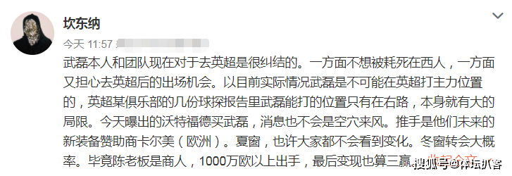 如今,博主"坎东纳"透露,武磊本人和团队现在也很纠结,不知道怎么办。一方面,如果在西班牙人效力,可能要常年踢西乙!但是,如果去英超,武磊又难踢主力!此外,武磊今夏可能不会离开,踢半个赛季西乙联赛后,武磊最有可能在冬窗走人。西班牙人老板虽然是中国人,但也是商人,如果有球队开价1千万欧元,他愿意成人之美。