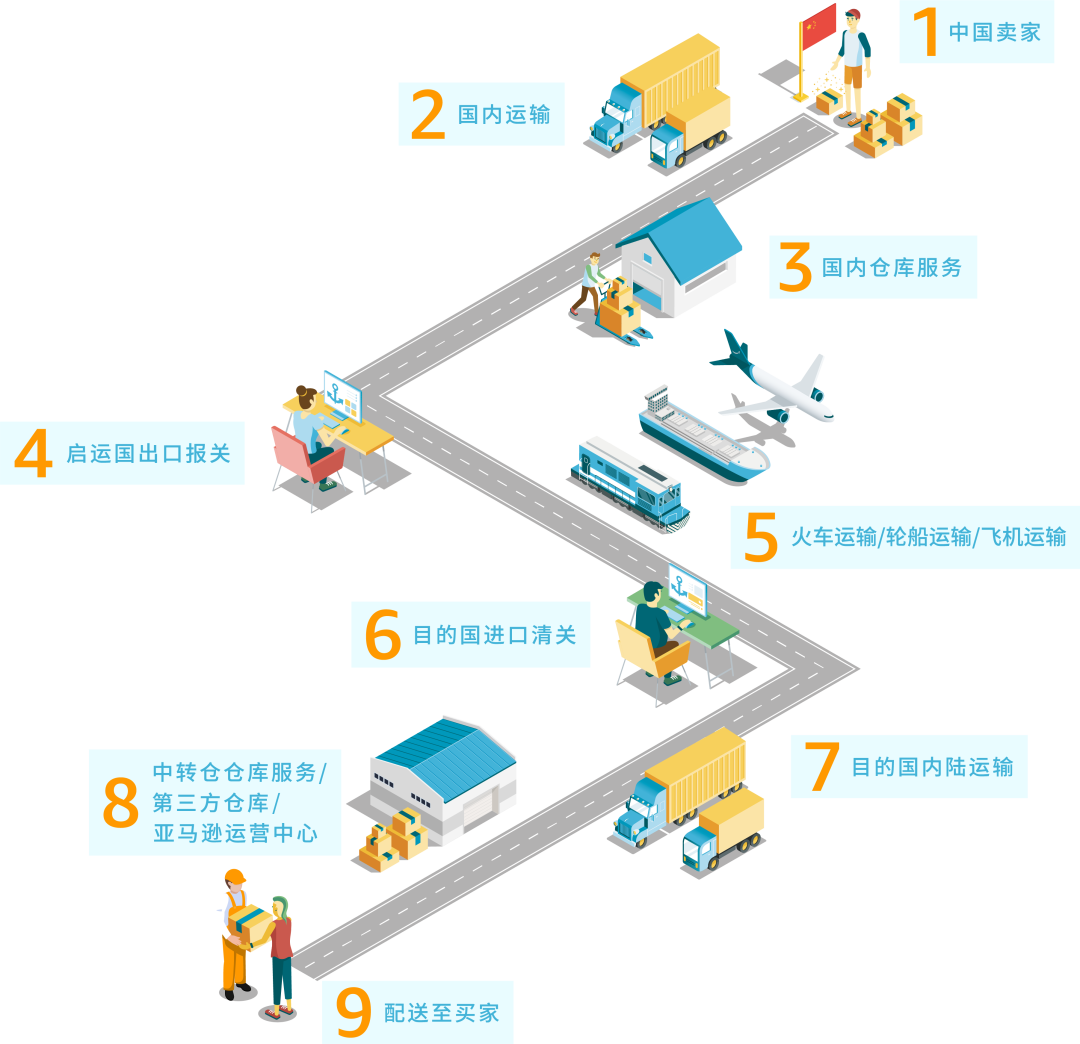 2/如果您将商品先运到目的国,再从目的国发货给当地消费者,那么流程将会是:1-2-3-4-5-6-7.1-7.2-8