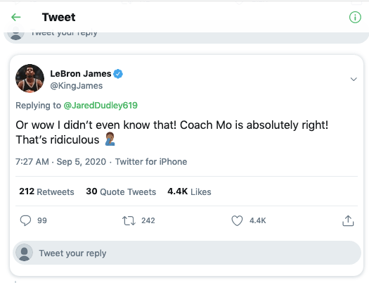 詹姆斯的这条推文很快就引来网友超过4400个赞,老詹的影响力果然是联盟顶级的,他的转发,也让更多网友关注到了教练在园区内的"生活困境",也得到了更多人的力挺。