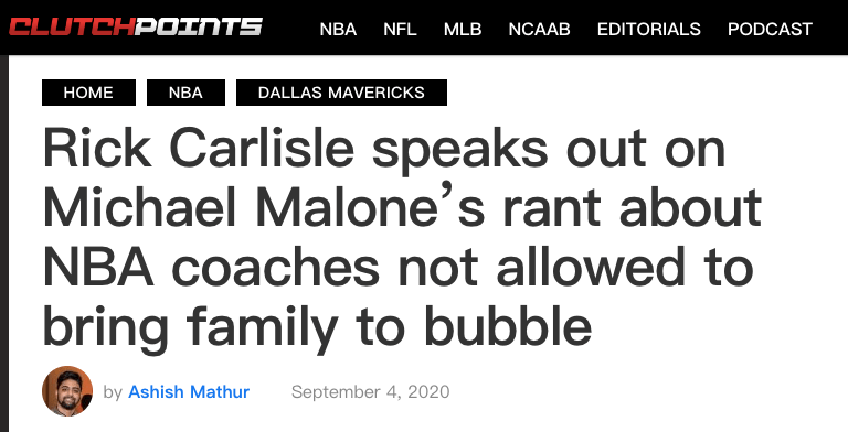马龙的爆料是很多媒体和球迷都不知道的,达拉斯独行侠主教练卡莱尔的另一个身份是教练协会主席,卡莱尔表示:"对于教练来说,长期离开家人,确实带来了很大的挑战,NBCA(裁判协会)正在与联盟办公室进行讨论。我们将继续作为合作伙伴与NBA合作,评估尚且留在奥兰多的教练的诉求。"