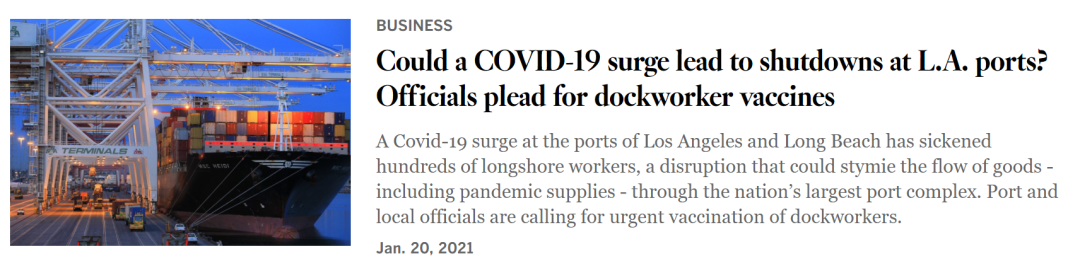 随着疫情在加州的蔓延,沿岸工人的感染率也在不断上升,这加剧了港口的混乱局面,这种混乱也正是由于新冠病毒所造成的一般商品货物进口量激增而引发的。港口高管、工会领袖和民选官员正在发起一场紧急运动,来帮助启动码头工人们的疫苗接种,他们担心劳动力的短缺可能会导致码头不得不关闭。