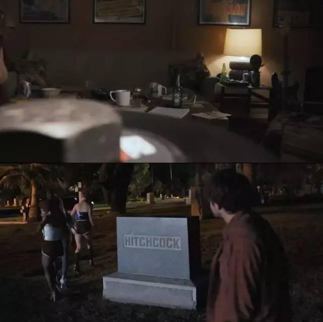 Sam的卧室简直就是大型的流行元素展示厅,希区柯克的电影海报[惊魂记]和[后窗]直接出现在墙上,连希区柯克的墓碑也成为了凸显影片悬疑风格的元素之一。