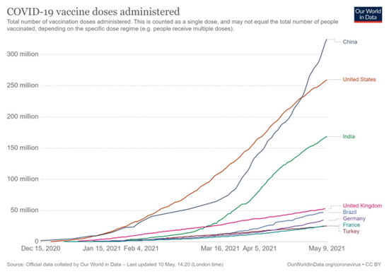 世界各国新冠疫苗接种数量。数据来源:Ourworldindata
