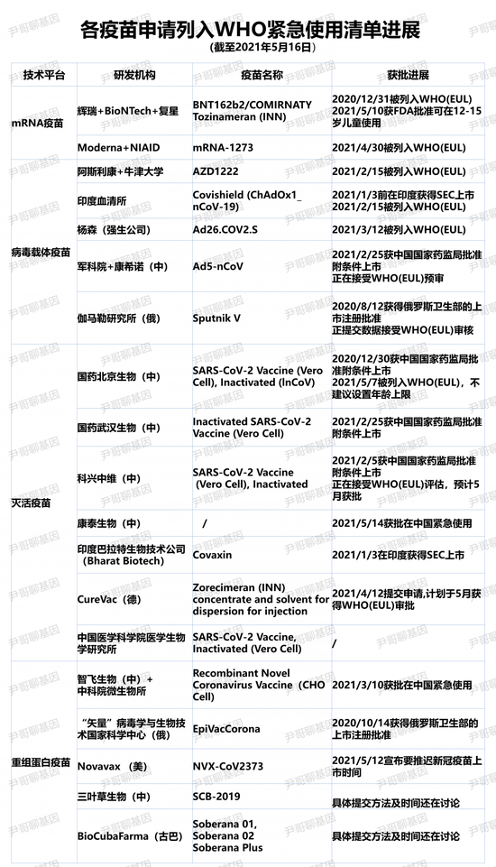 截止至5月16日,有13种疫苗正在申请WHO紧急使用授权,6种新冠疫苗已列入该清单。他们分别是辉瑞/BioNTech新冠疫苗、两种阿斯利康/牛津新冠疫苗、美国强生新冠疫苗、美国Moderna新冠疫苗、以及中国的中国国药的灭活疫苗。