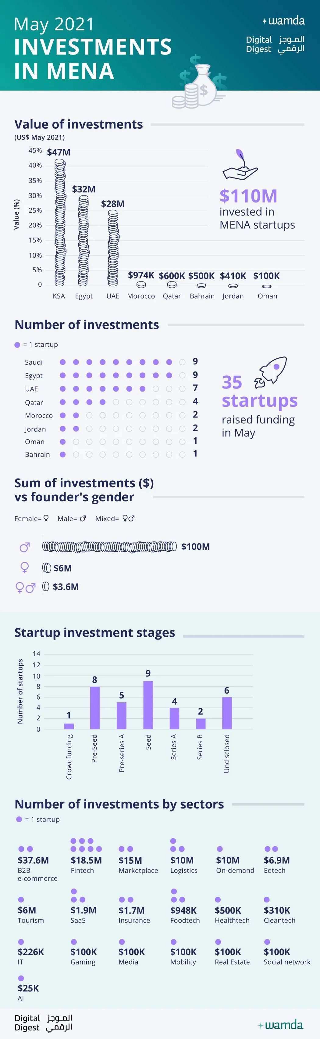 5 月,九家沙特初创公司筹集了 4660 万美元,这一数额主要来自Sary 的 3050 万美元 B 轮融资。与此同时,埃及的 9 家初创公司筹集了 3200 万美元,而阿联酋再次落后,其中 7 家初创公司筹集了 2840 万美元。