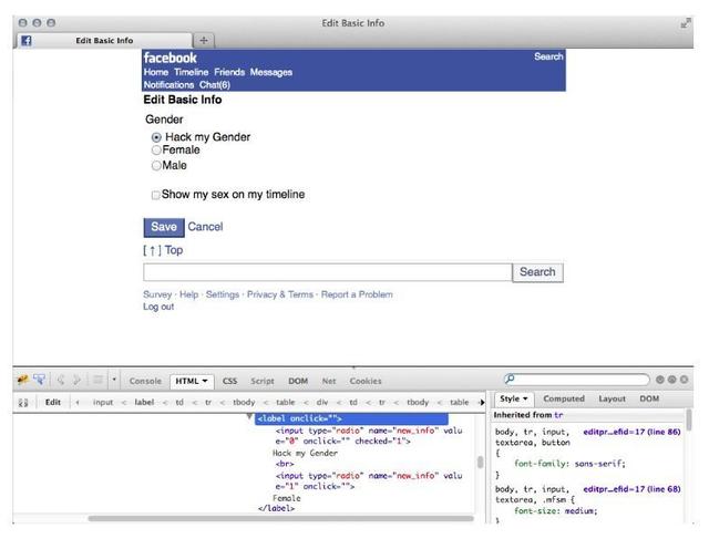 2004 年,刚刚成立的 Facebook 并没有把性别设为注册必填项,用户只需要填写姓名、电子邮箱和职业就可以拥有一个个人主页。2008 年,性别成了注册 Facebook 时无法略过的信息,而选项中除了男、女两性,也曾经出现过一个彩蛋——如果你懂编程,可以选 hack my gender。