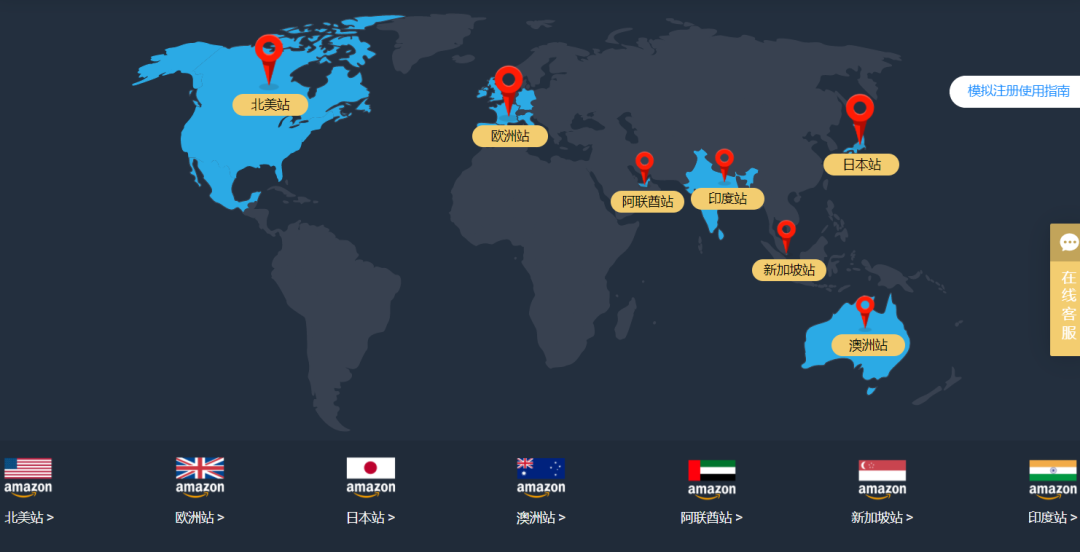 2. 根据导航进入亚马逊模拟注册,然后选择你需要注册的站点根据模拟注册站点的提示开始模拟注册。