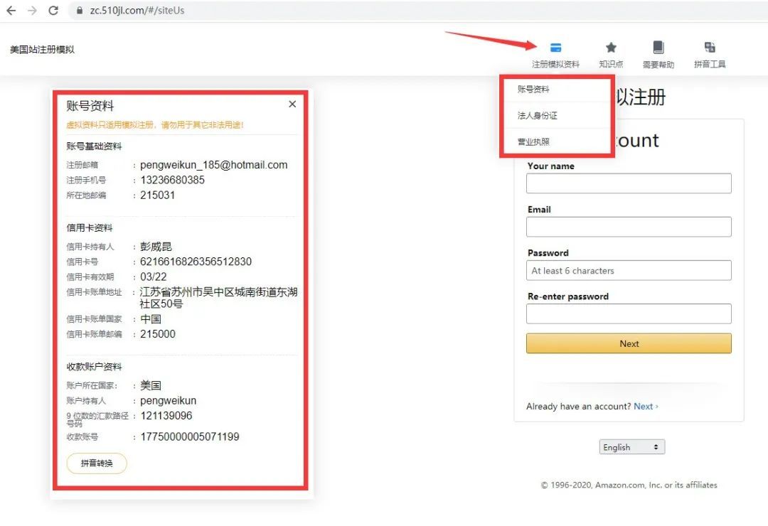 如果你还没有注册过亚马逊账号的经验,又担心会毁掉自己的真实资料,建议去这个网站,测试一下。
