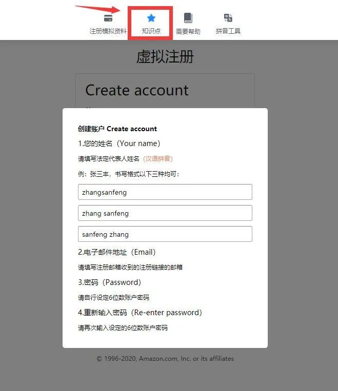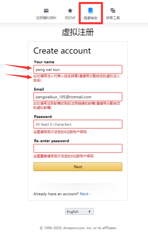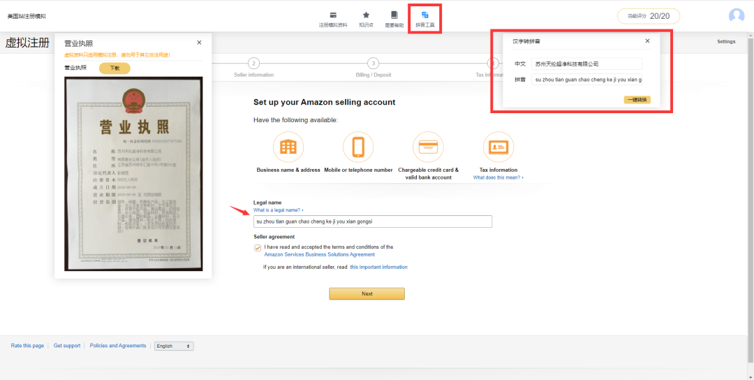 6. 在模拟注册时,填写的名称、企业名字、地区名字等,请注意要用拼音代替。毕竟亚马逊是国外平台,所以使用中文是不会通过的。在这个系统中也很贴心的提供了一键转换拼音的功能。