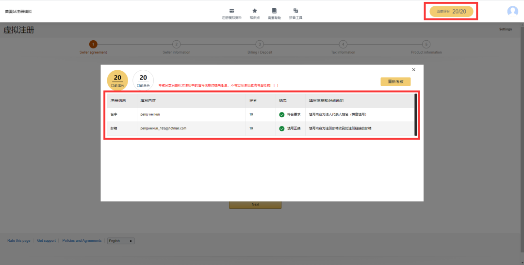 7. 模拟注册完后可以点击查看当前评分,一旦不是满分,就代表着注册资料填写有误。
