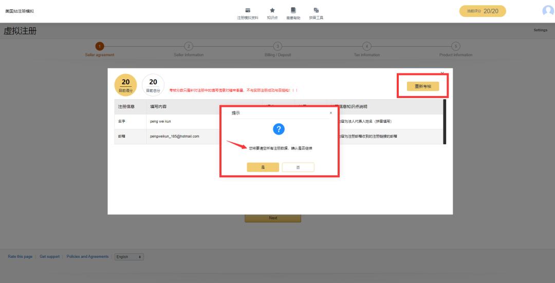 4. 在模拟注册的每一个步骤都有【知识点】按钮,可以点击查看当前界面填写的资料是否规范。