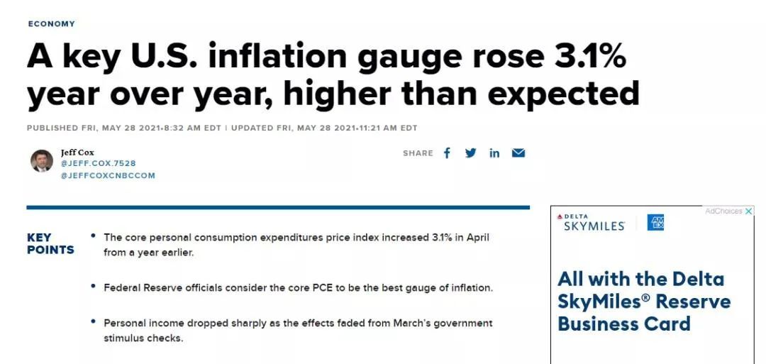 据美国商务部统计数据,美国4月份个人消费支出(PCE)物价指数同比上升3.6%,超过预期值3.5%,大幅超过前值2.3%。这是该通胀指标2008年以来的最快增速,远高于美联储的官方通胀目标2%。
