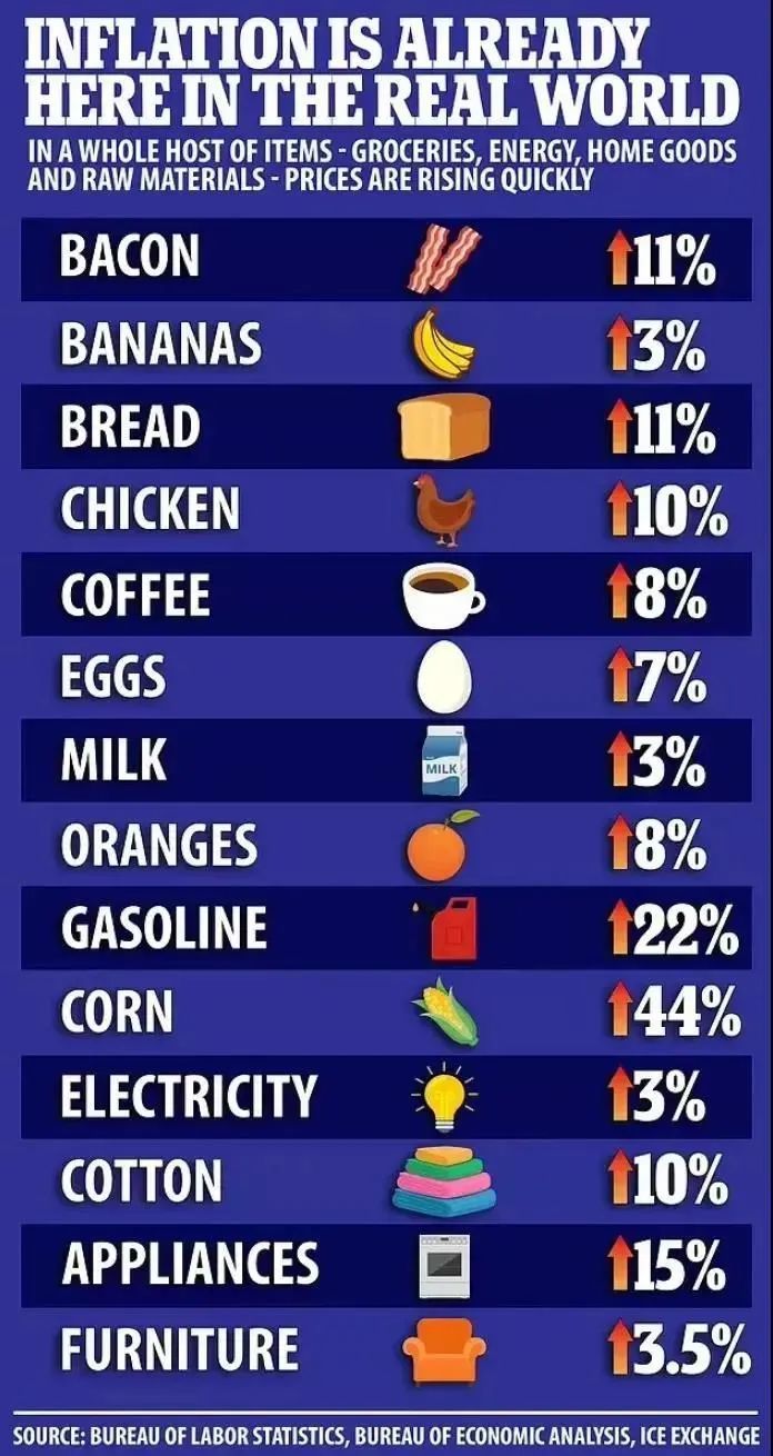 据美国当地的记者调查,统计了线下各大商超后,发现日常消费品的涨价非常普遍,基本上都在4月份涨了10%左右,其中玉米的涨幅最夸张,高达44%之多!