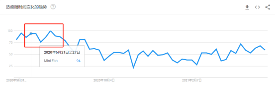 全球温度升高,几乎每人出门携带一款迷你风扇。谷歌趋势里显示2020年mini fan迷你风扇在6月中旬开始热卖,截止到9月左右才明显下降,由此推断出今年的6月迷你风扇也会是个竞品。