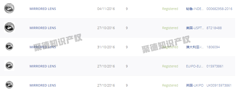 还有MIRROED LENS镜面镜片关键词在美国、澳大利亚、英国、秘鲁等国家注册了9类商标。