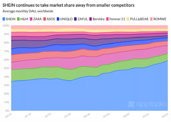 (Apptopia 4.19-4.21 全球头部快时尚品牌日活)SheIn已是一座耸立云霄的高峰。它的迅速崛起,引起众多业内人士的慨叹。一位从事跨境电商10余年的深圳朋友告诉亿观先生,SheIn创始人许仰天,这样的一位二本院校的毕业生,"秒杀"了众多北大(如跨境通创始人徐佳东)、常春藤名校毕业生(安克创始人阳萌),真是充满传奇色彩。确实,许仰天的起点,要比深圳众多一线跨境电商企业的创始人更低。尤其是与安克创始人阳萌,差异最大。许仰天与阳萌,同为80后,相差仅2岁,但两个人成长经历迥异。许仰天出身穷苦,小时候经常"馒头泡酱油",高三开始一边读书一边打工,最后上了一个二本普通大学。