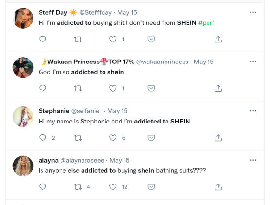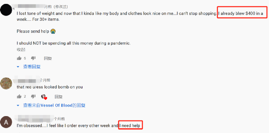 事实证明,SheIn策略是有效的,确实是很多用户深度"上瘾"。 在推特(Twitter)和YouTube上搜索"addicted to Shein"的词条,我们会发现,大量用户承认,已经对SheIn上瘾了。一些用户称,"我沉迷于逛SheIn,购买很多我并不需要的东西。""我一个星期在SheIn上就买了400美元!根本停不下来,疫情期间,真不该花那么多钱"" 有谁跟我一样,乐此不疲地在SheIn上购买泳装?"诸如此种。