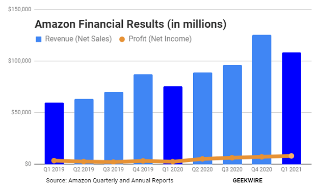 亚马逊公布了其2021年Q1季度财报。根据财报数据显示,该财季,亚马逊净销售额1085亿美元,同比增长44%,每股收益为15.79美元,利润为81亿美元,营业利润率为8.2%,超出了此前市场分析师做出的季度营收1040亿美元,每股收益9.54美元的预期。