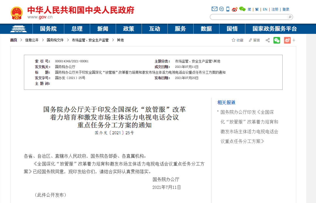 党中央、国务院高度重视深化"放管服"改革优化营商环境工作。2021年6月2日,李克强总理在全国深化"放管服"改革着力培育和激发市场主体活力电视电话会议上发表重要讲话,部署持续一体推进"放管服"改革,打造市场化法治化国际化营商环境,培育壮大市场主体,更大激发市场活力和社会创造力。为确保会议确定的重点任务落到实处,现制定如下分工方案。