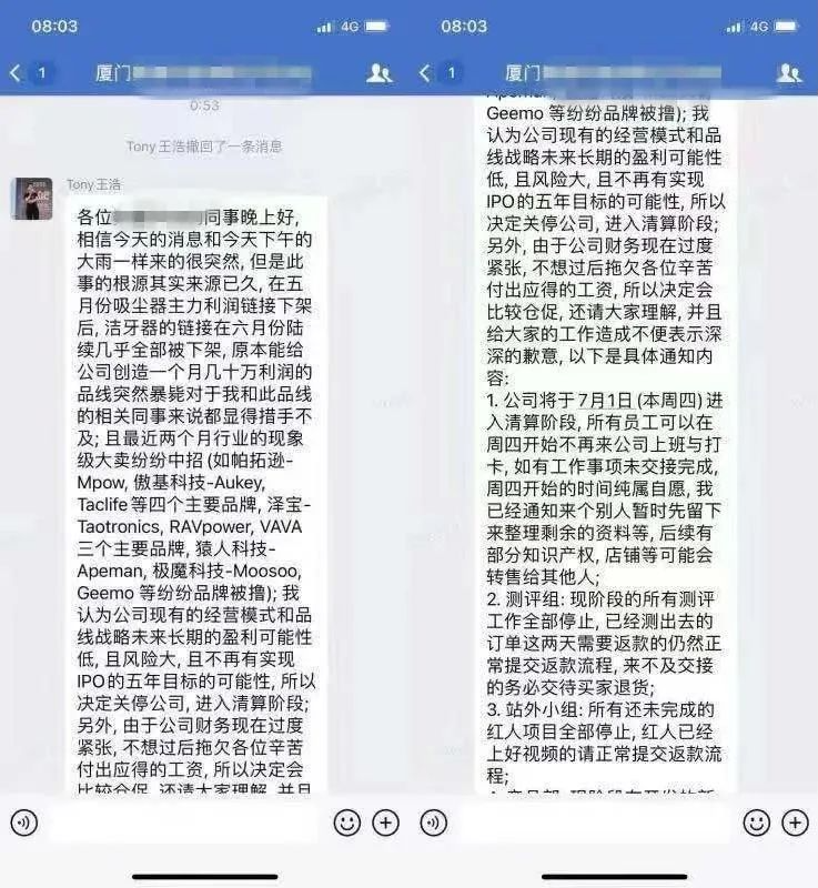 厦门某知名跨境电商企业老板在公司群内向员工们发出了一则破产通告。
