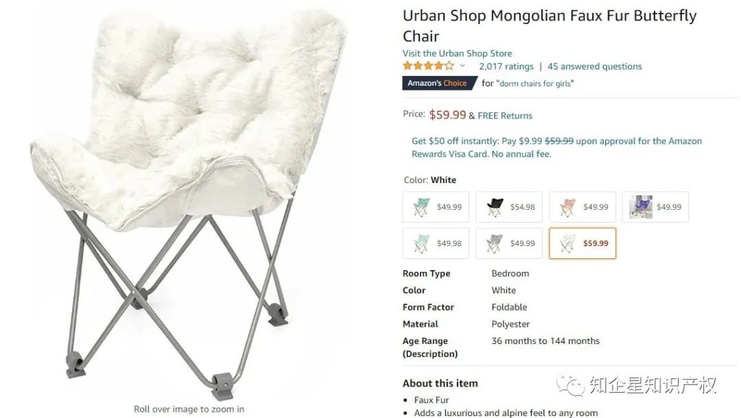 今天在浏览亚马逊的时候,就看到一款蝴蝶椅,它是美亚站的Amazon'sChoicefor "dorm chairs for girls",售价59.99美金,留评2017颗星。