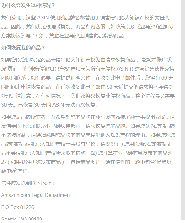 对此,有卖家注意到,这次收到的邮件和以往我们见到的侵权邮件似乎不太一样。在这次的官方邮件里,并没有提及任何侵权相关的条款,更没有给卖家提供有效的申诉路径。