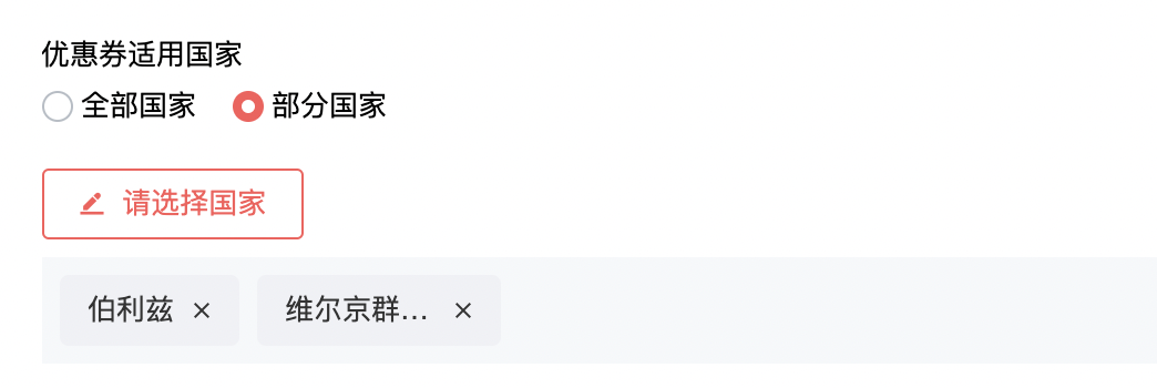 若选择"全部国家",则所有国家的用户都可以看到并领取该权益;若选择"部分国家",则仅选中国家的用户可看到并领取该权益。
