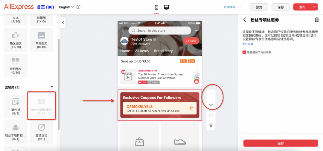 粉丝模块需点击"店铺",选择店铺装修-首页-编辑,从左侧营销类"粉丝专享优惠券"拖拽到右侧,可支持上下移动。
