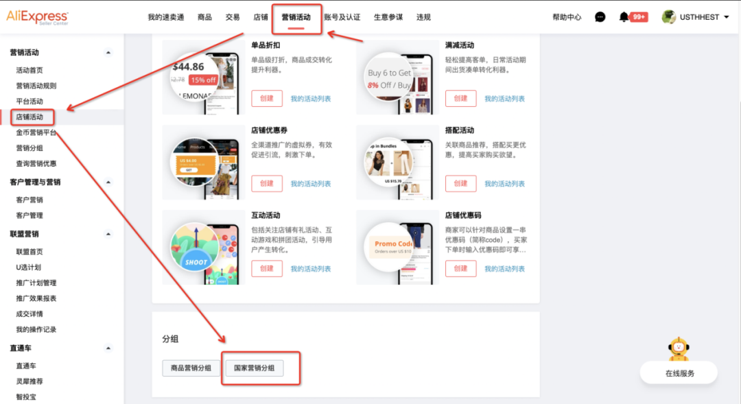 登录商家后台,进入营销活动-店铺活动,在页面下方会有如下国家分组入口。