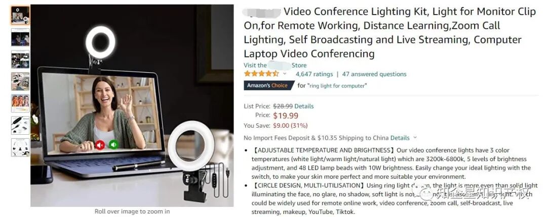 今天在浏览亚马逊的时候,看到一款夹子补光灯,它是美亚站的Amazon'sChoicefor "ring light for computer"售价19.99美金,留评4674颗星。