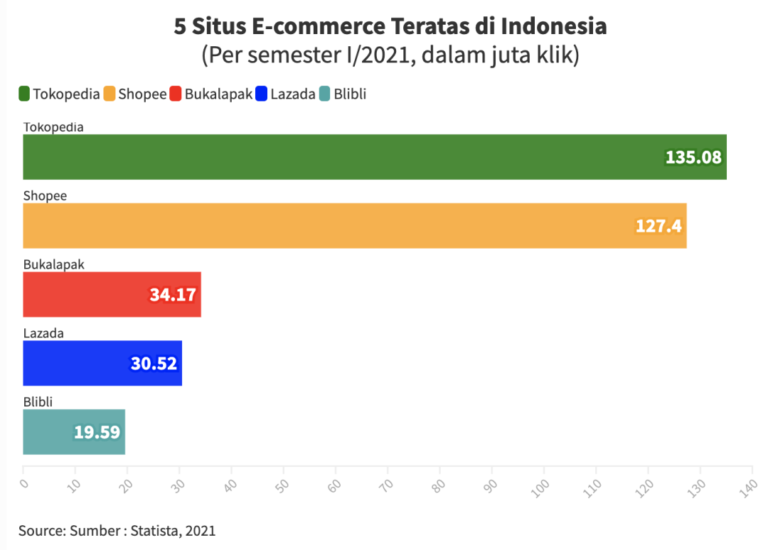 Statista 报告称,在 2021 年上半年,Tokopedia 的网站访问量高达 1.3508 亿次;Shopee 为 1.247 亿次;Bukalapak 为 3417 万次;Lazada 为 3052 万次;Blibli 为 1959 万次。