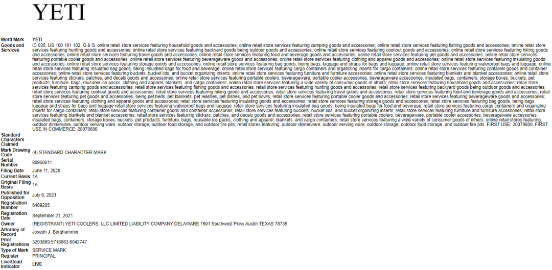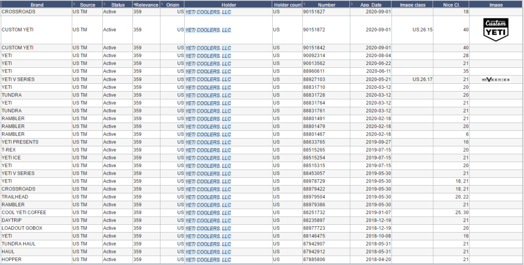 YETI旗下有众多商标和专利,有卖相关产品的卖家要注意一并规避: