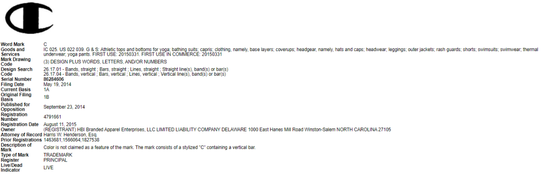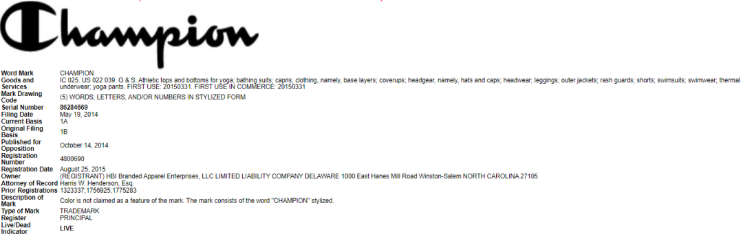 涉及商标:品牌名称Champion及C字LOGO