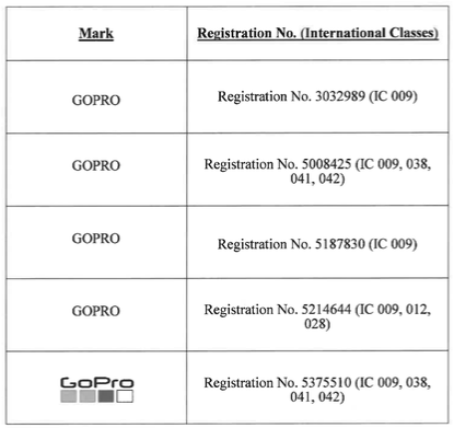 主要涉及文字商标GoPro及品牌logo,注册在多个类别: