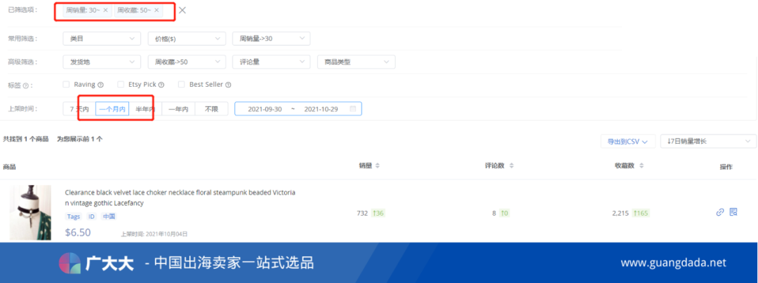 对亚马逊平台熟悉的卖家都知道,亚马逊的部分头部商品会有类似"A+"、"Amazon Choice"等标签,Etsy平台与亚马逊类似,也有一些官方标签,具体如下:● Raving:近期好评较多;● Etsy Pick:平台推荐;● Best Seller:畅销商品;考虑到通过Etsy平台前台难以组合筛选标签,广大大Etsy选品板块设置了上述3个标签的组合筛选项,卖家可以选择多个标签筛选自己的意向商品: