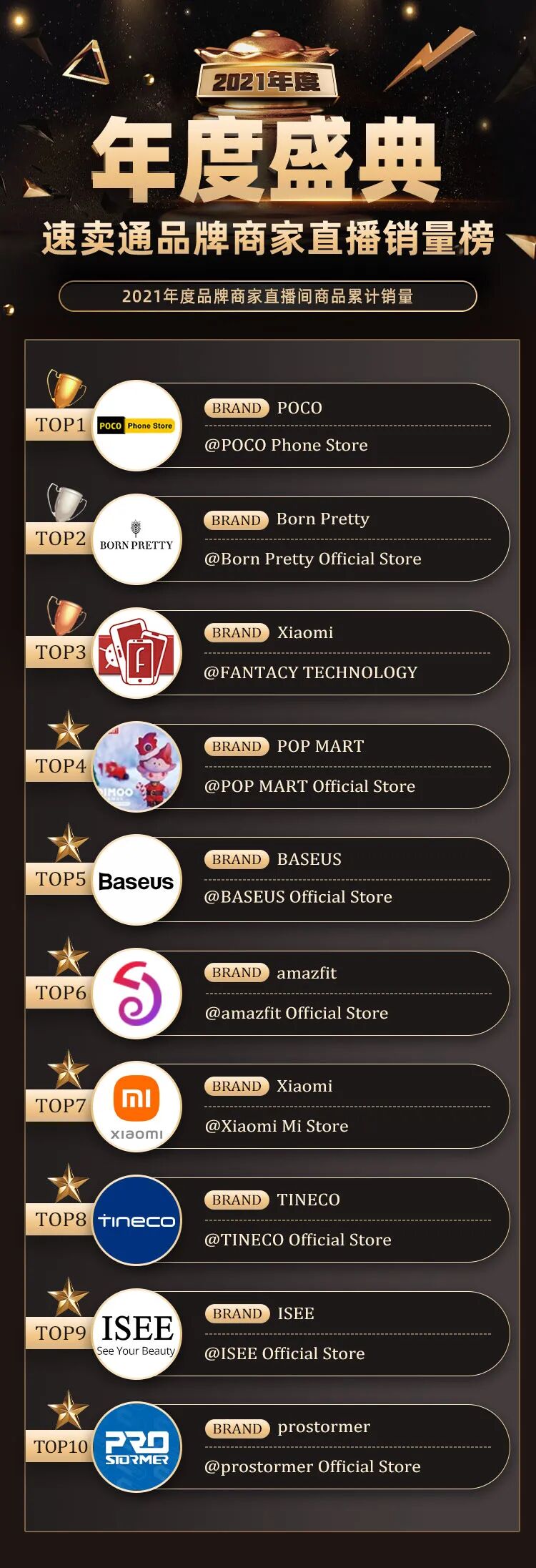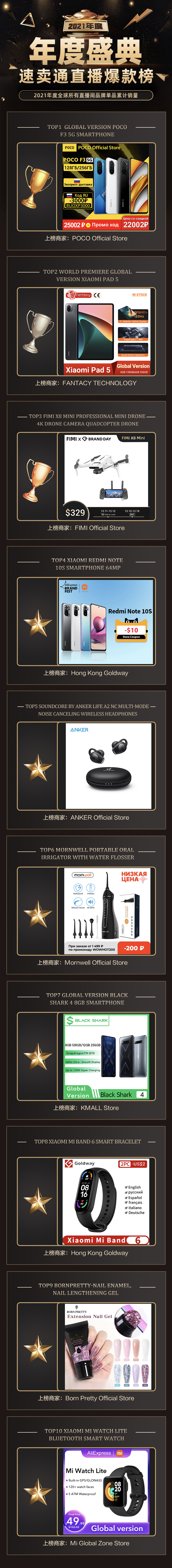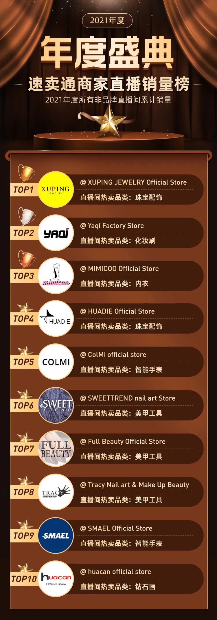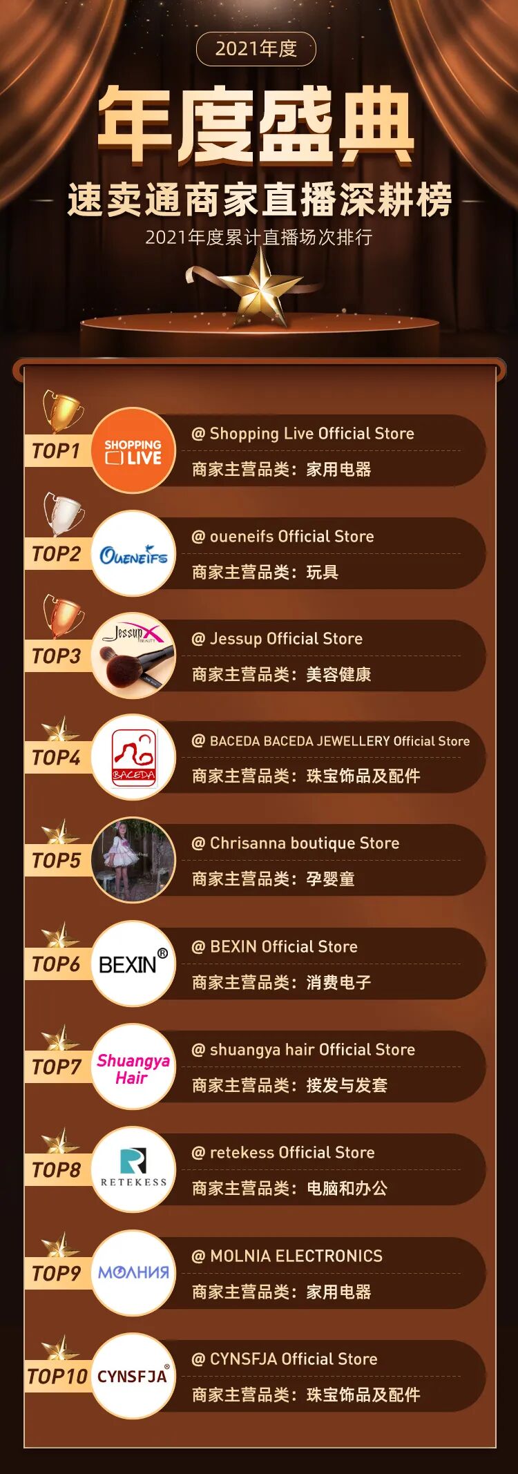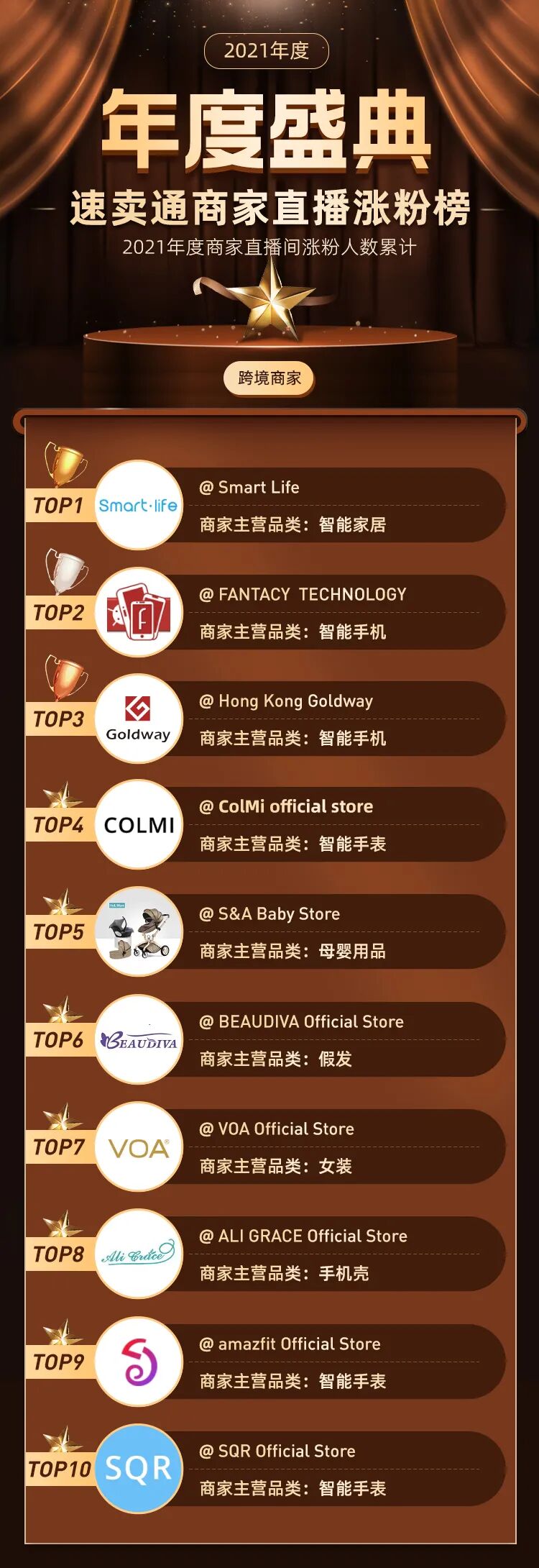 近日,全球速卖通发布了"2021年度盛典速卖通内容直播商家榜单",覆盖了品牌商家、非品牌商家的直播销量、直播场次、直播涨粉数,短视频互动数,官方和达人直播间累计爆款等排名信息,现在就让我们一起揭晓,哪些全球速卖通上的出海商家,惊喜上榜!