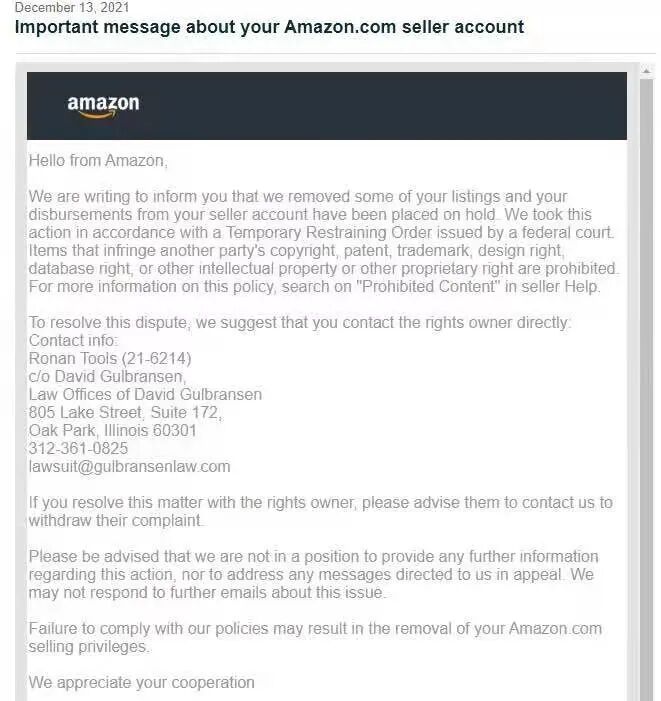 跨境屋粉丝爆料,圣诞前夕,再有大批卖家亚马逊平台资金冻结的通知,背后疑似是流氓律所意图坑害卖家。希望所有销售同类产品的卖家联合起来,组团反诉流氓律所!