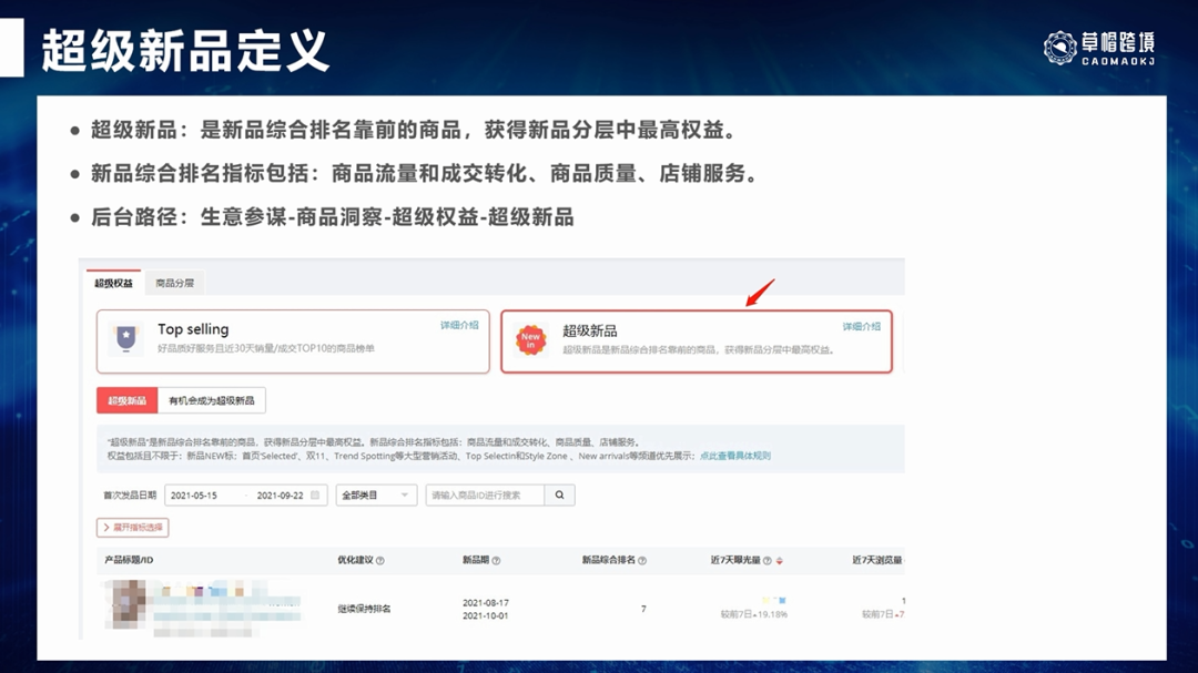 首先我们来看一下超级新品解析:超级新品定义、超级新品综合指标评分、超级新品权益。