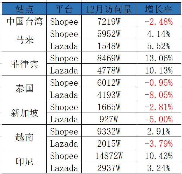 根据Similar Wed分析出了12月的lazada,shopee各站点的数据分析。