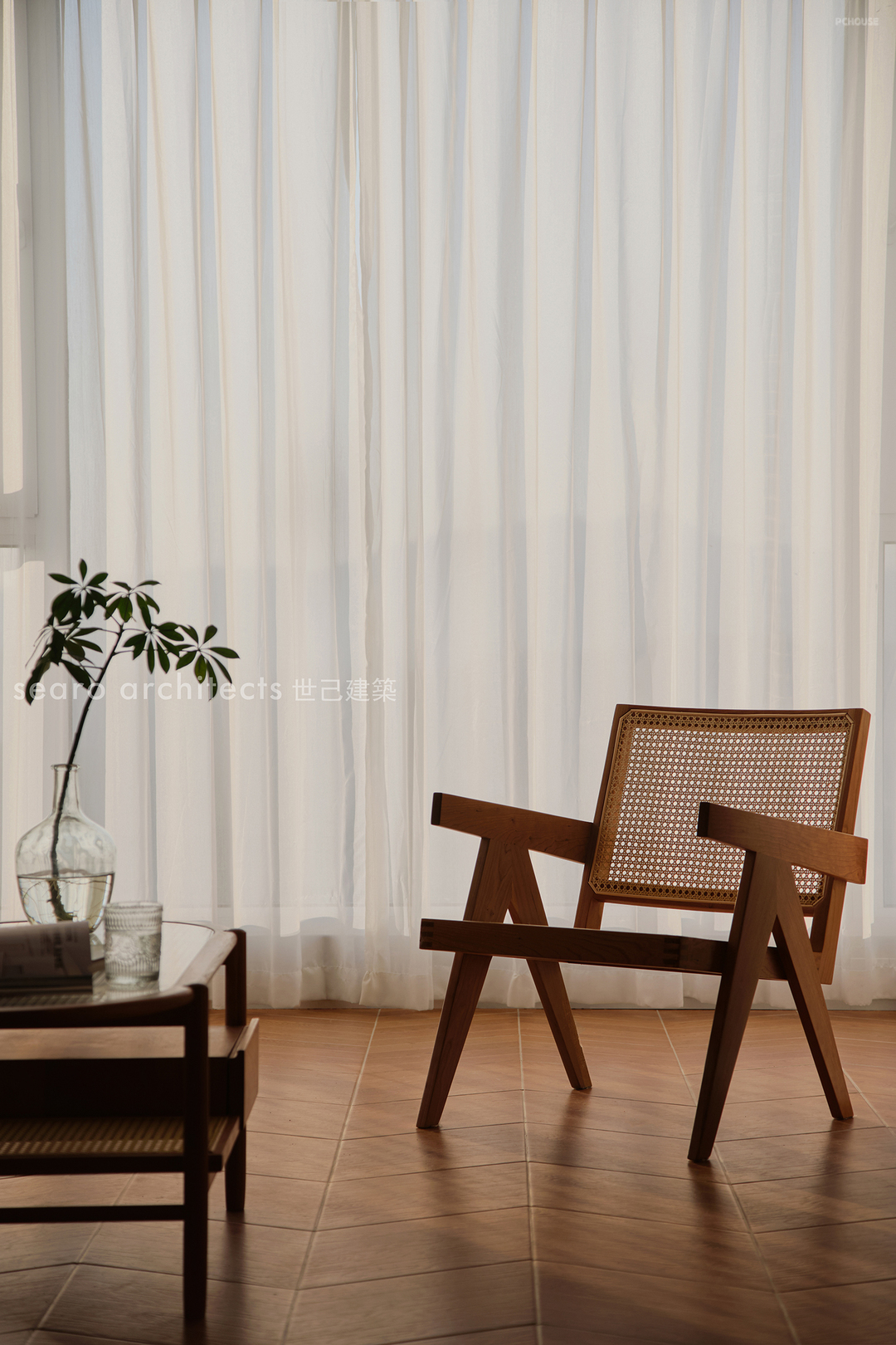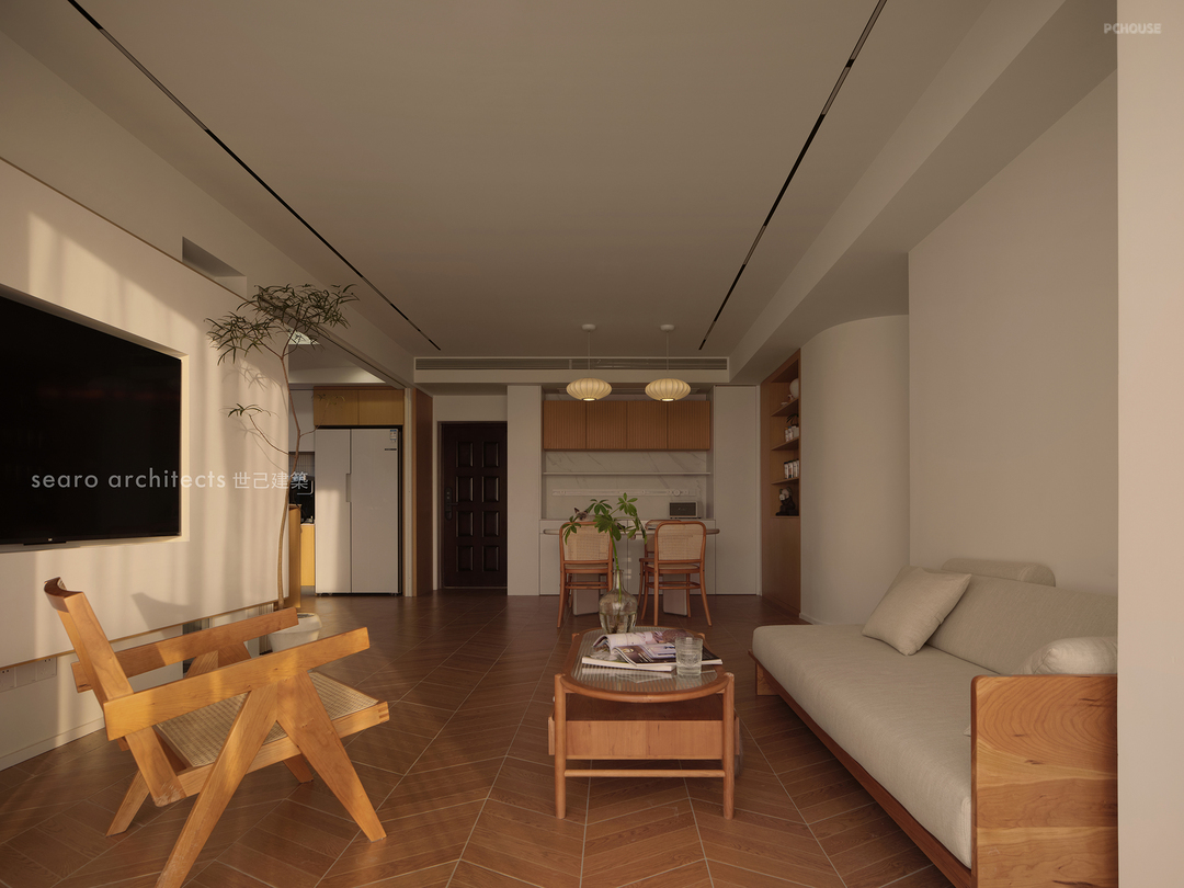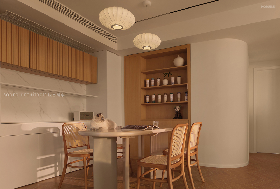 本案的空间设计以块面、弧面的设计手法让空间流畅干净,暖白乳胶漆为空间的主要基调,搭配局部木制藤编来传递温暖的信号。