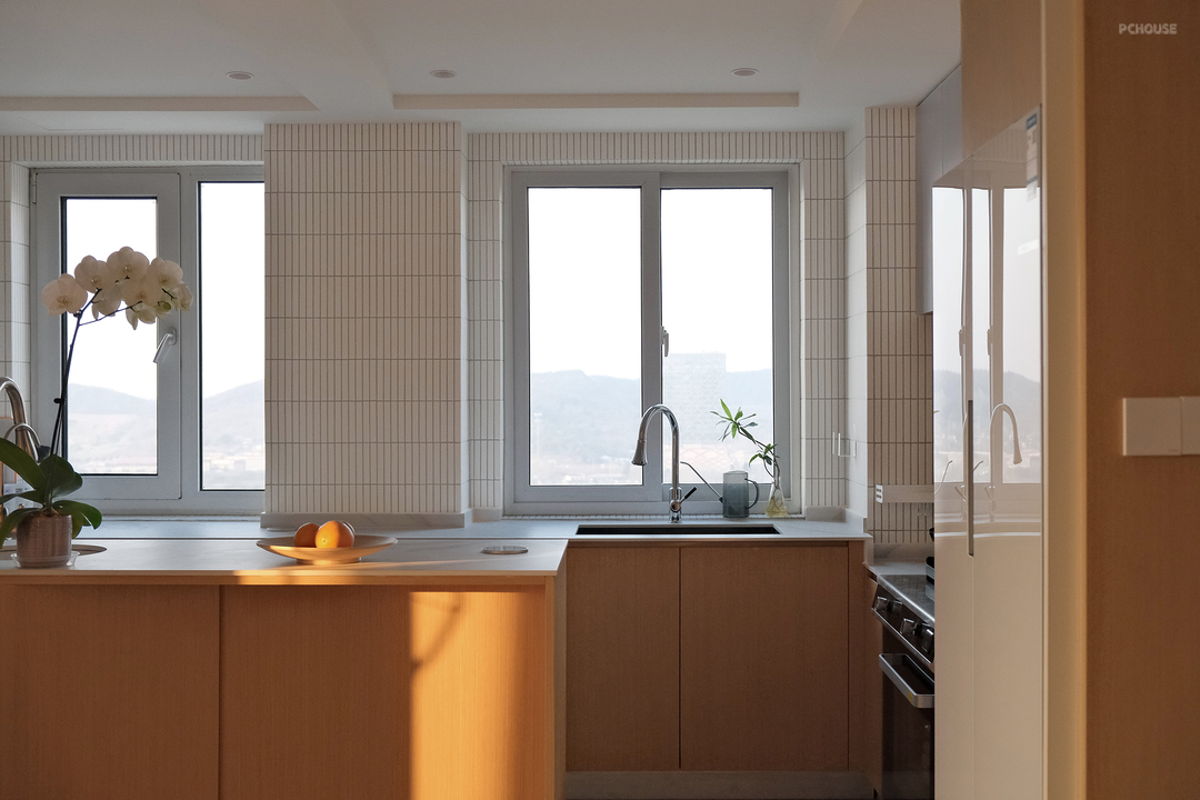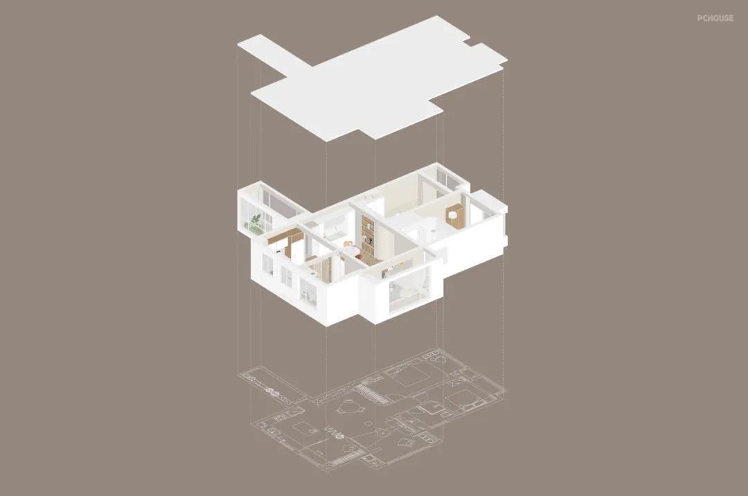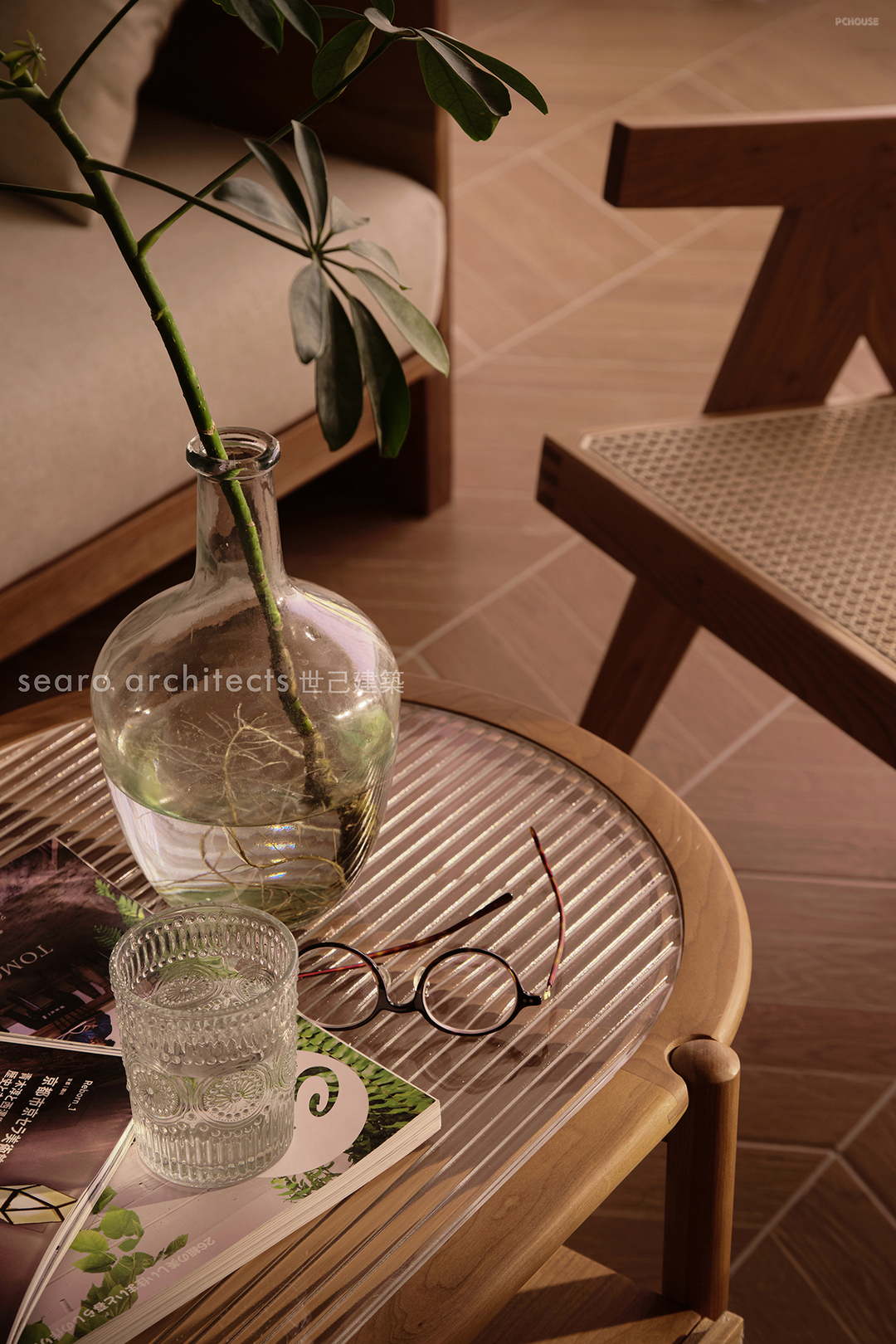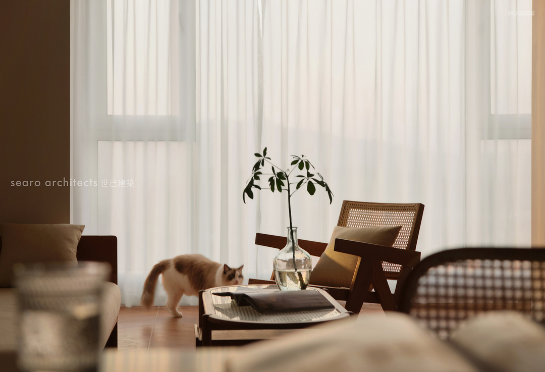 本案的空间设计以块面、弧面的设计手法让空间流畅干净,暖白乳胶漆为空间的主要基调,搭配局部木制藤编来传递温暖的信号。