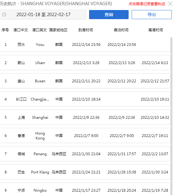 近一个月Shanghai Voyager挂靠轨迹。截止目前,该船仍位于韩国光阳港,处于靠泊状态。根据长锦商船官网船期数据,该船接下来停靠的港口包括上海港和宁波港。