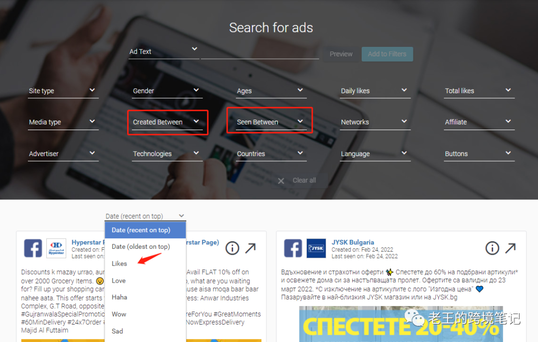 如果你想推某个产品,可以先到AdSpy上搜索相应关键词,按照Likes倒序,查看市场上已经推广的情况。值得注意的是有的产品可能有多个关键词,可以逐个进行搜索!