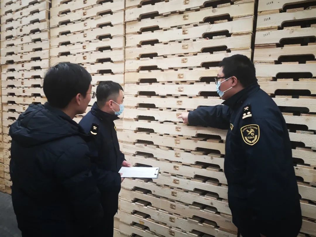 海关关员正在进行出境木质包装标识加施企业现场监管