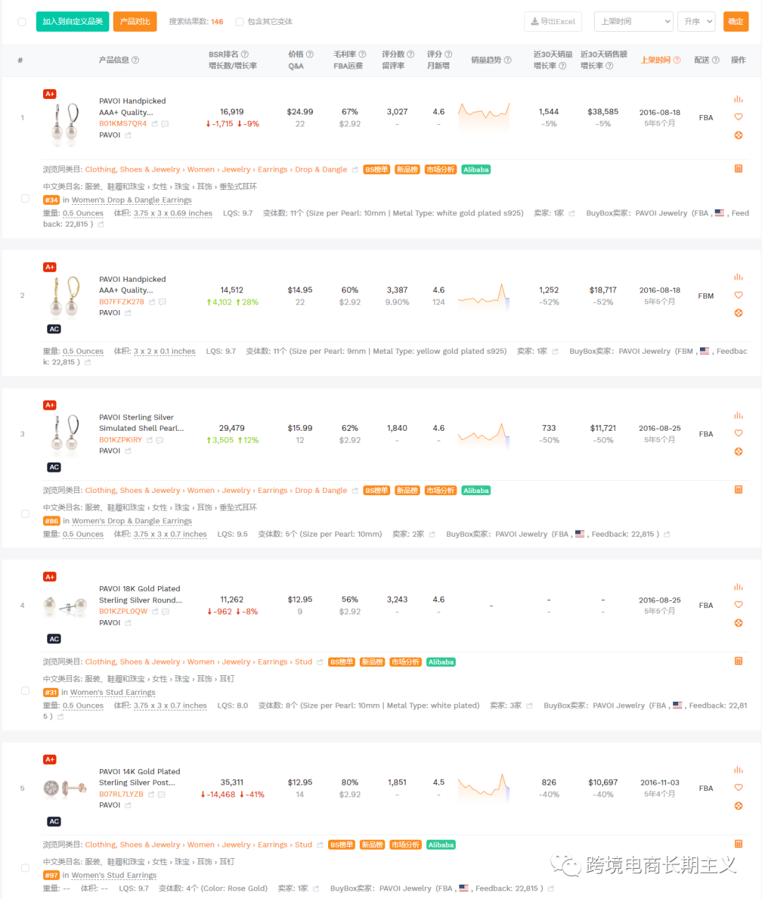 任何的创业都不是一帆风顺的,拿Pavoi来说,他们2016年8月18号在亚马逊上架的第一款产品是一对纯银淡水珍珠耳环,到时到今天已经近6年过去,月销量仅仅只有1500单左右,我列举他们初期上架的5款产品,大家可以看下:
