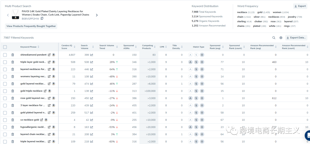 接下来我们需要看的就是这款产品的流量情况了,我用helium10查询到的结果是目前一共有7987个关键词在源源不断的给它贡献流量。