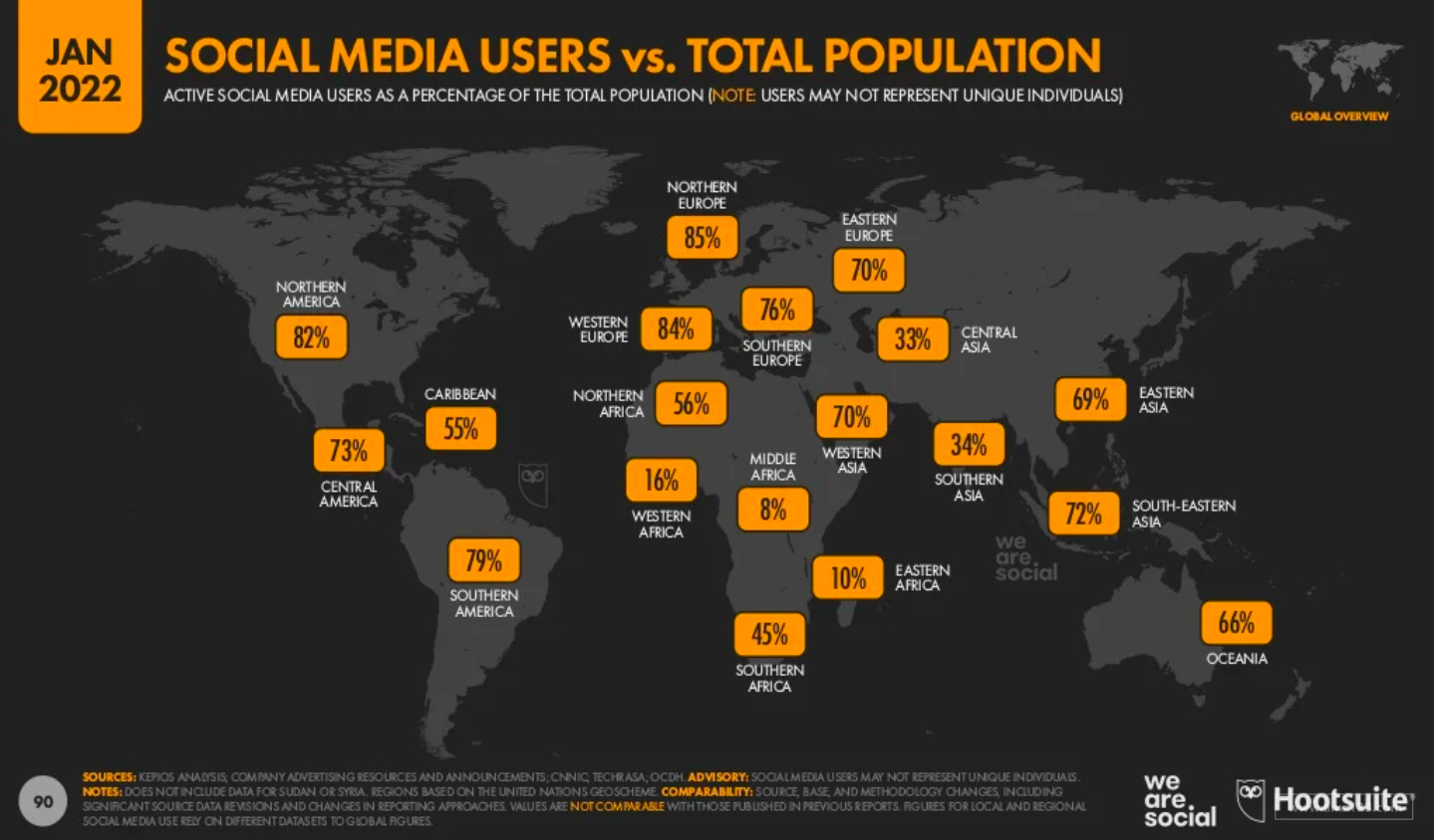 东亚互联网用户占全球的24.7%,东南亚占9.8%。欧洲和北美分别占13.6%和7%。东亚社交媒体用户占全球27.6%,南亚和东南亚分别占15.7%和11.6%。