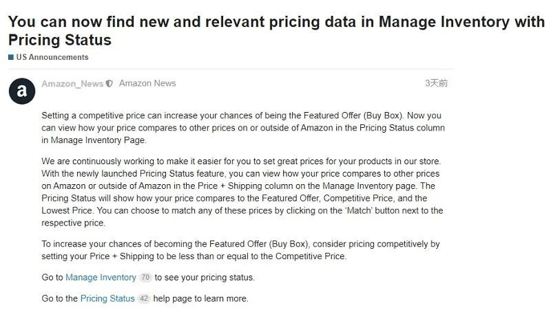 亚马逊欧洲站和美国站将推出新功能"定价状态功能"。卖家借助这个新功能可在"管理库存"页面中点击"价格+运费"这一列,查询和对比自己即将销售的商品在亚马逊和亚马逊以外的同类商品的价格。