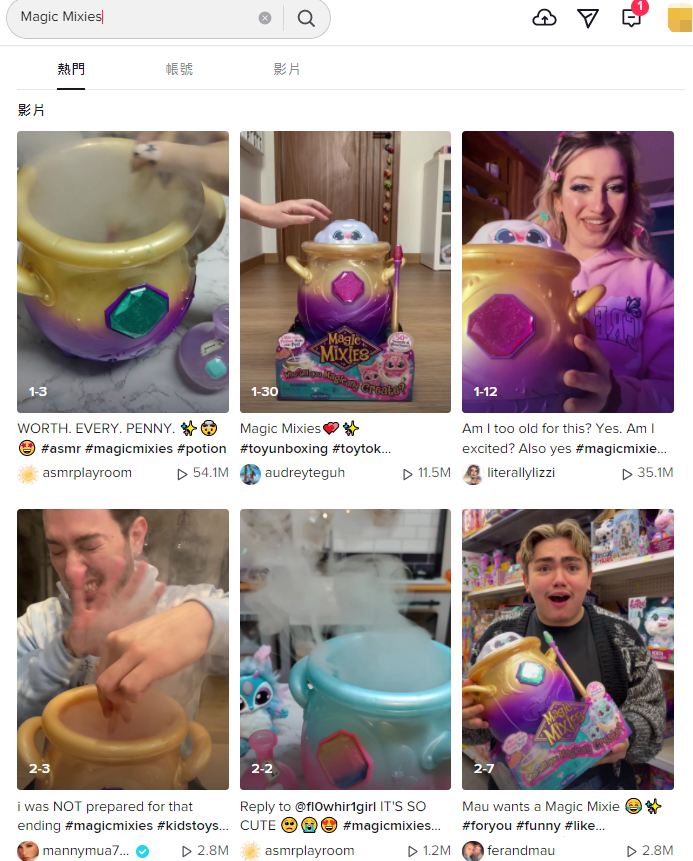 嘀嗒狗发现TikTok玩具博主@asmrplayroom在1-3日发布体验视频,吸引大量用户关注,从而在平台引发一场"magicmixies魔法雾锅"的狂欢。![]()
