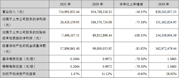 杰美特披露2021年年度报告,报告期公司实现营收7.15亿元,同比下降16.35%;归母净利润2642万元,同比下降75.16%;扣非净利润亏损近750万元,由盈转亏,上年同期为8981.29万元。